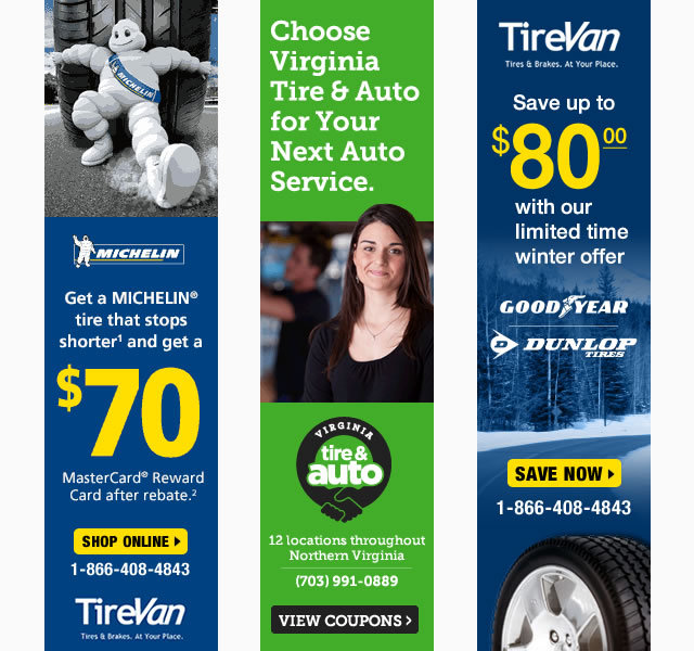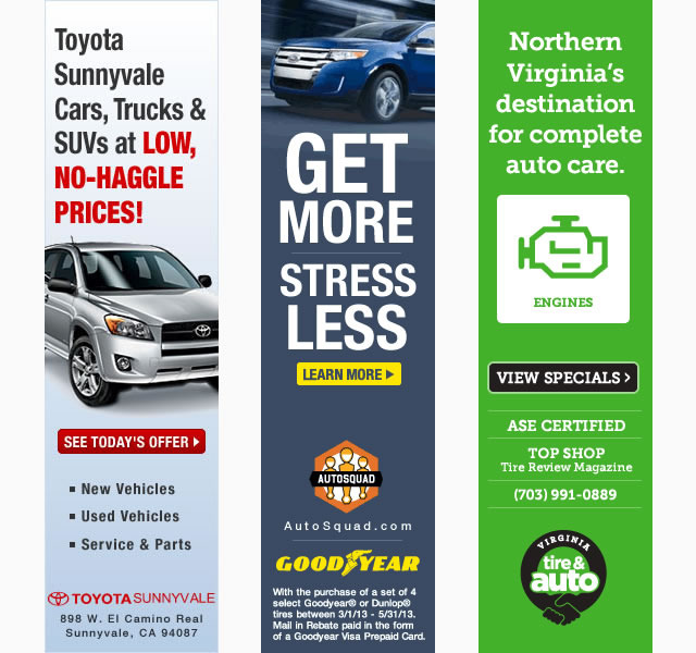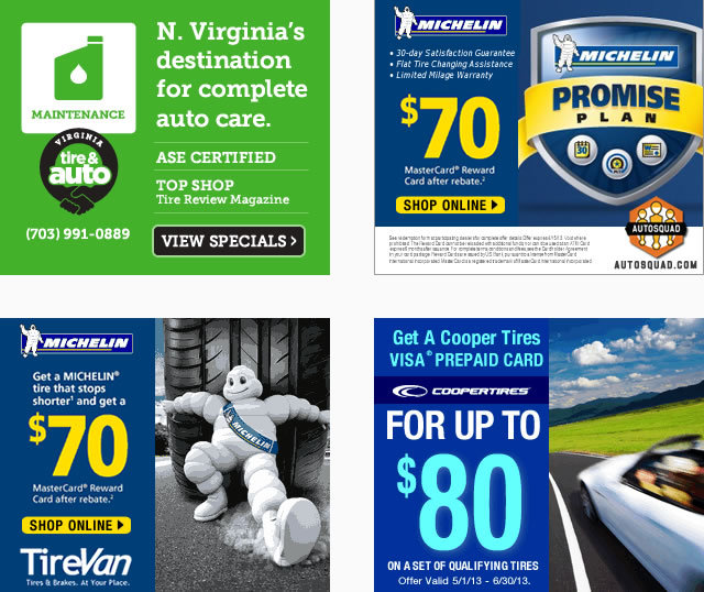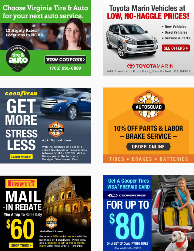 Design examples of banners for the automotive vertical space for clients such as Virginia Tire & Auto, Toyota Marin, AutoSquad, TireVan and Toyota Sunnyvale.