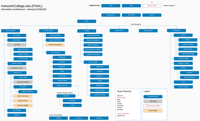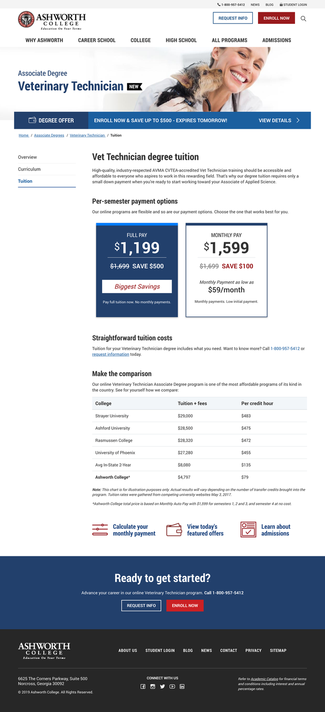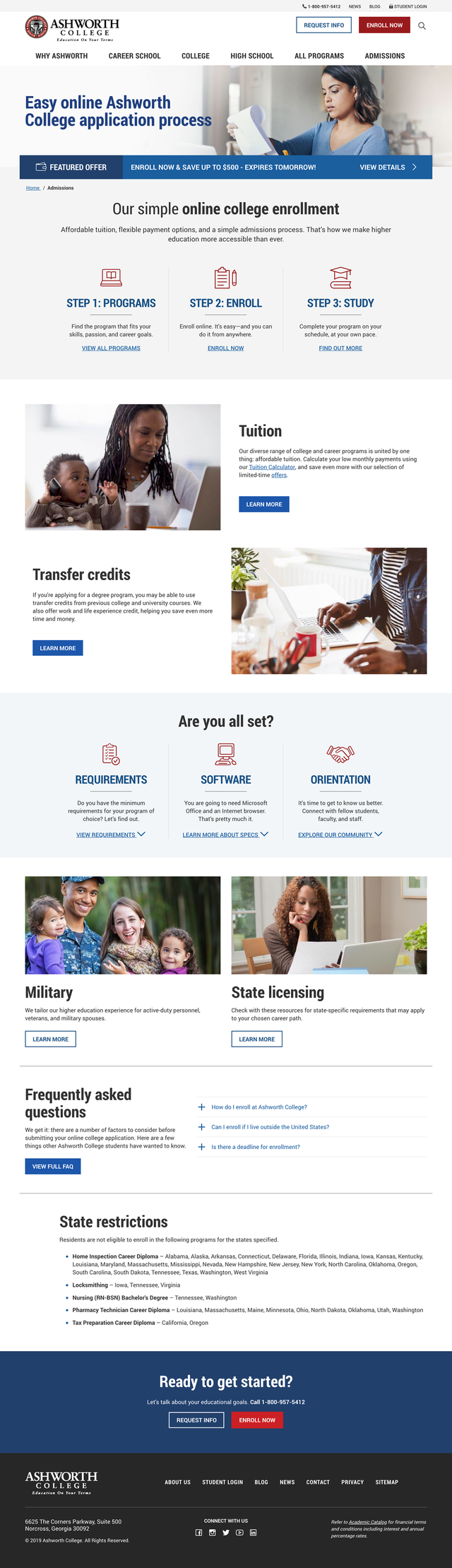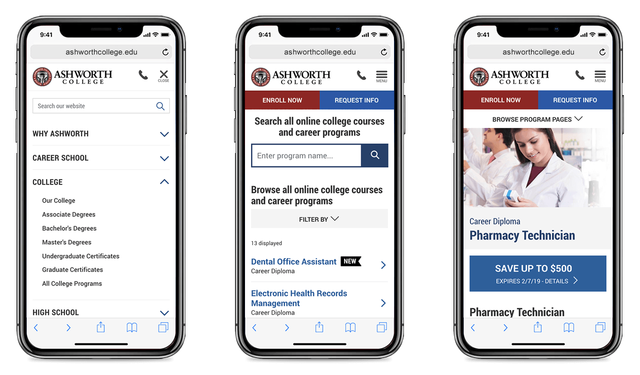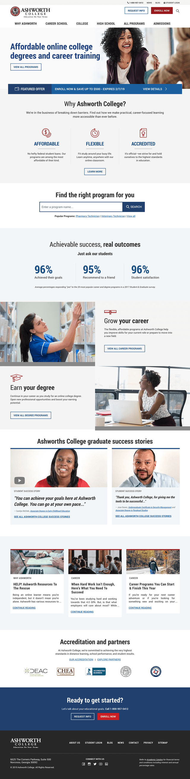 Website redesign project part of an overall rebrand campaign for Ashworth College. Worked with outside agency on overall brand position. Site built using Joomla CMS as base with additional custom applications.