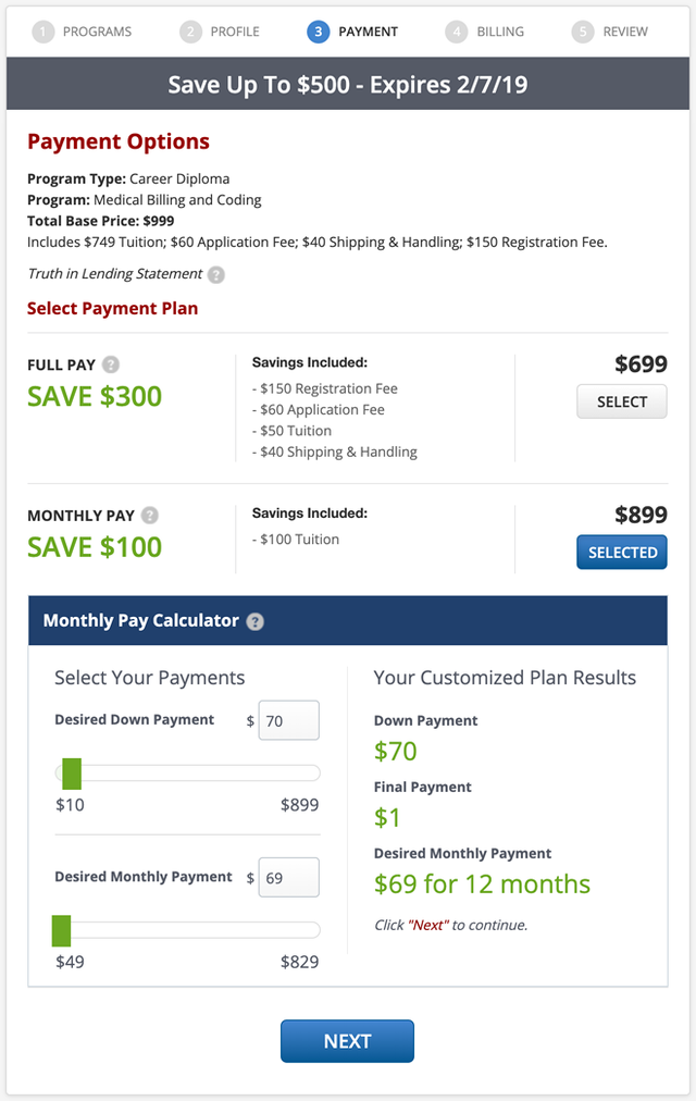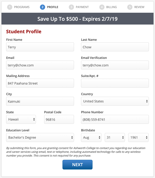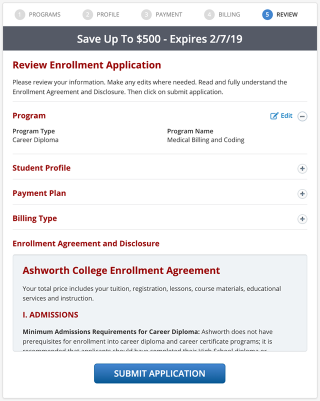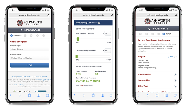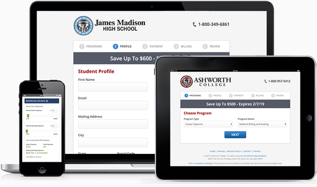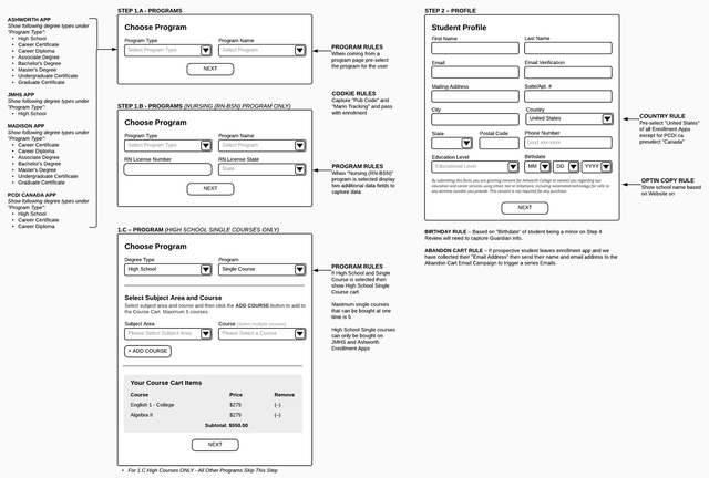 Enrollment App designed to be used on four school Websites with unique rules for each. Schools include Ashworth College, James Madison High School, Madison School of Healthcare and PCDI Canada.