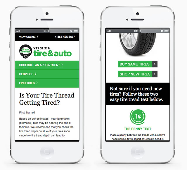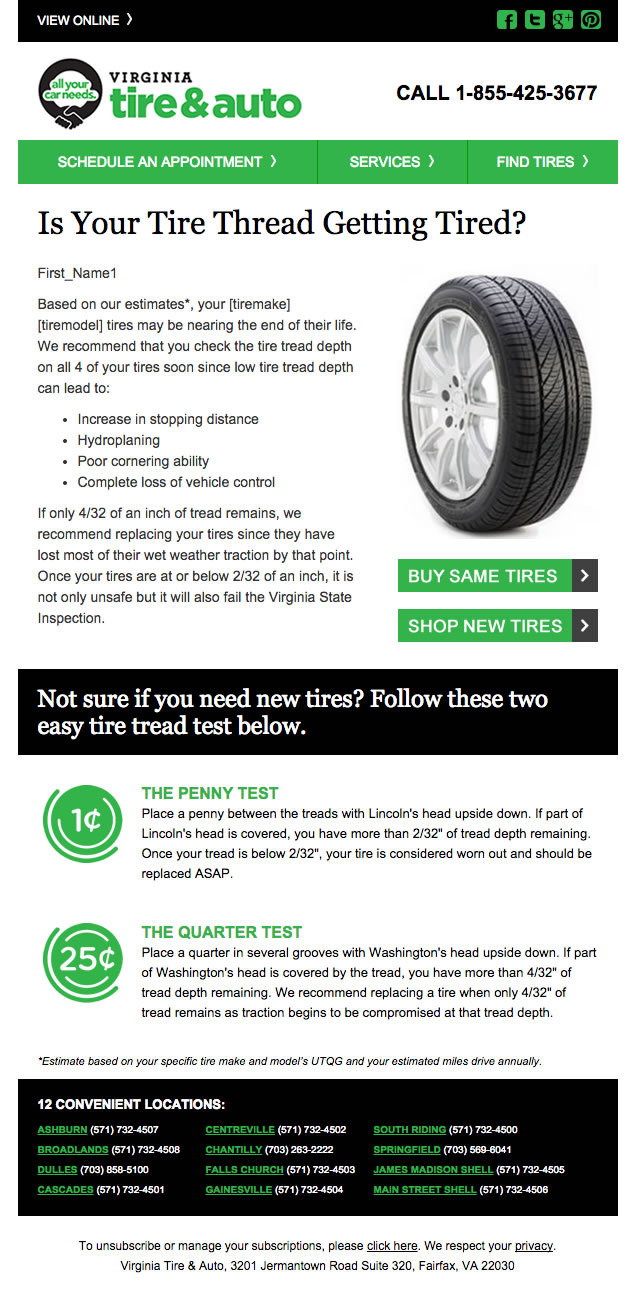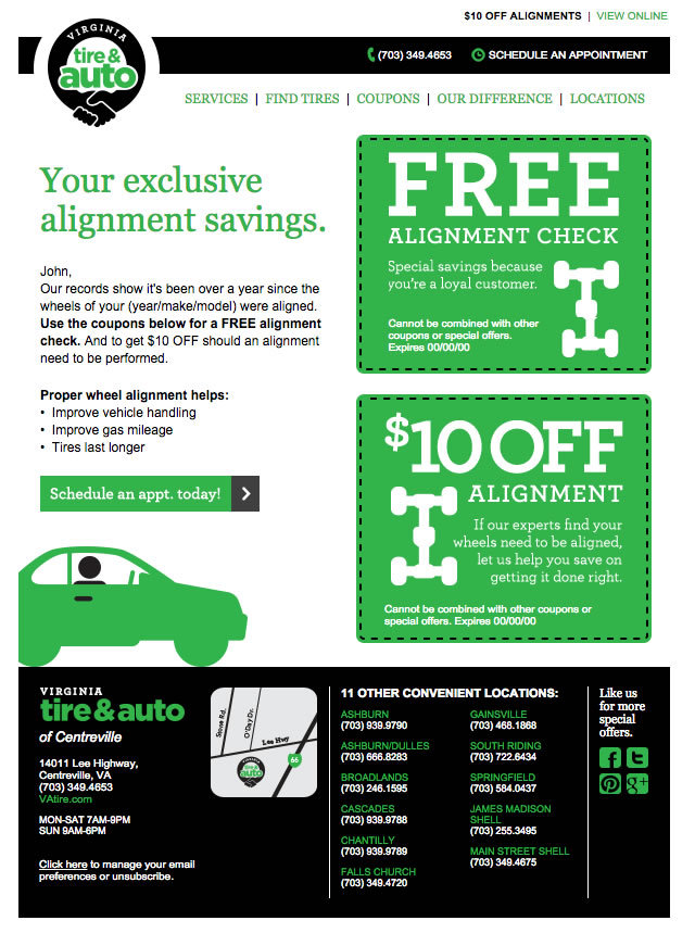 Response Email design for Virginia Tire & Auto to promote new tire purchases and alignments.